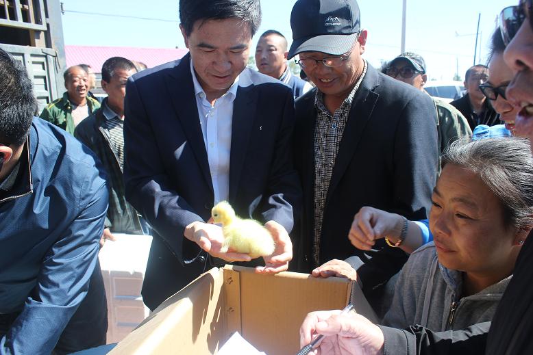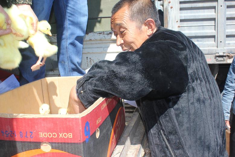 8:40投放活动正式开始,于院长和扶贫办人员为每户被包保对象发放了30只鹅雏和4袋饲料,并给大家提供了雏鹅的饲养办法,对鹅成龄后的销路做了提前谋划,如果贫困户有好的销路可自销,没有销路的以6.5元/斤的保底价回收,保障被包保人的利益,对因事、因病没能前来领取的贫困户,直接送到家里,老乡非常的激动,张颖主任的包保对象在外乡居住,年事已高,还照看孙女,来不了现场,张主任驱车前往,送鹅上门,并考虑到端午节将近,带了200个鸡蛋慰问老人,她的这种作为不单单是完成任务,而是发自内心的想帮助有需要的人,她的精神值得所有包保人学习!