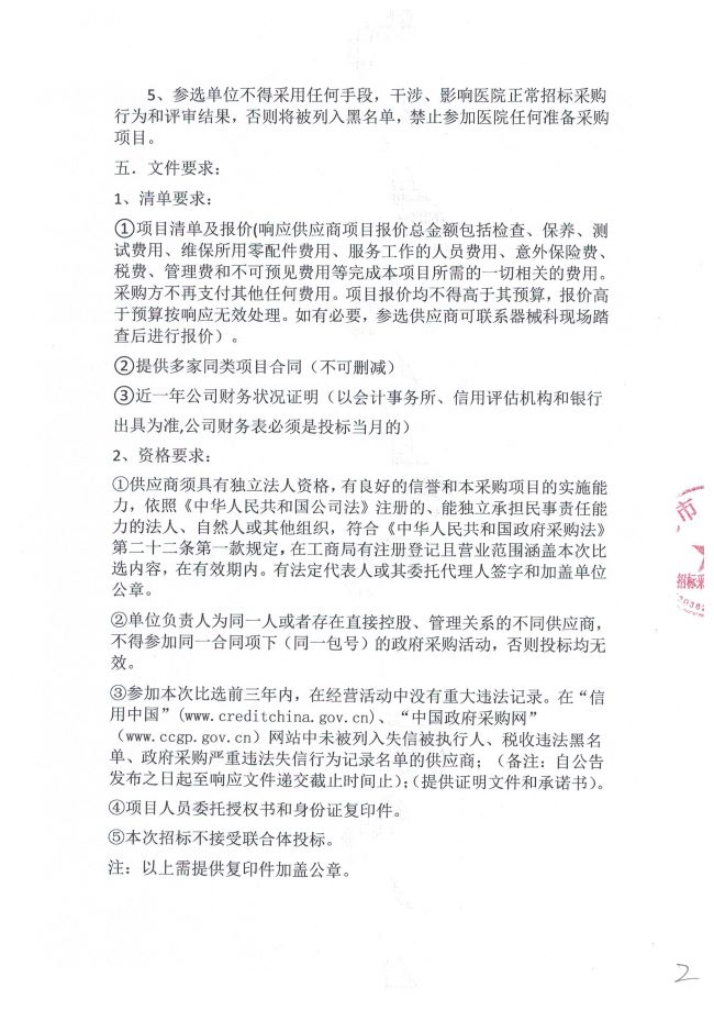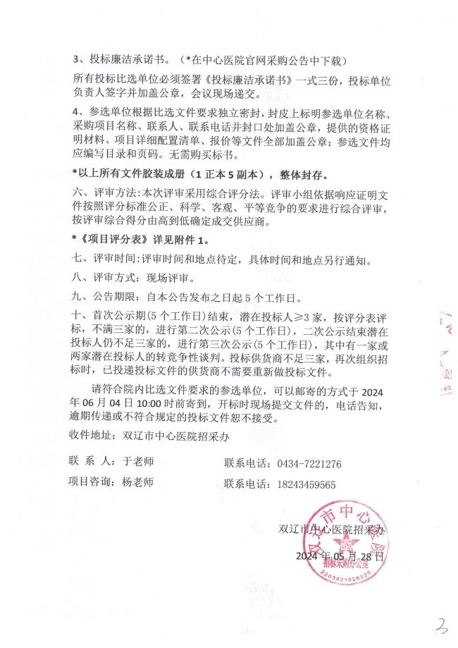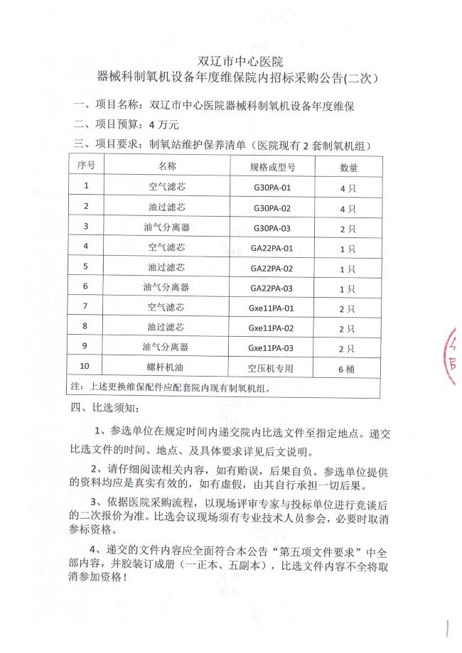 双辽市中心医院器械科制氧机设备年度维保院内招标采购公告(二次)
