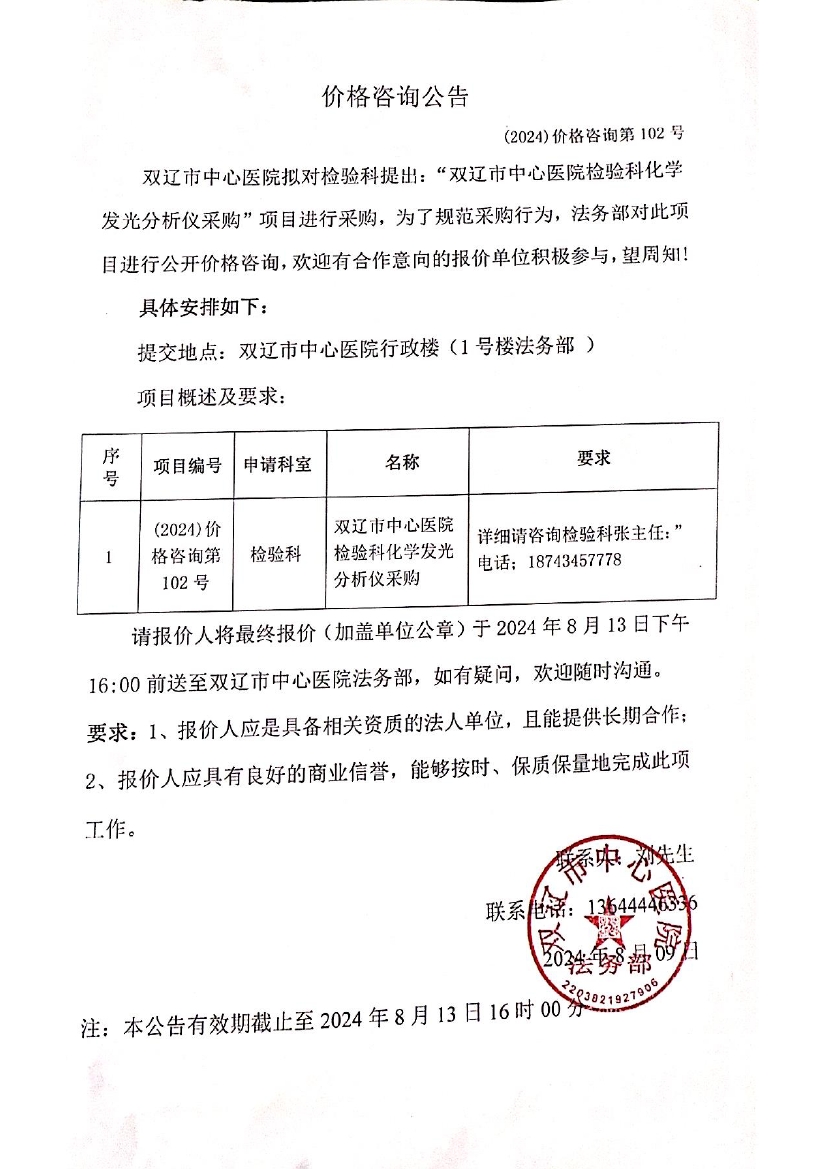 双辽市中心医院检验科化学发光分析仪采购价格咨询公告