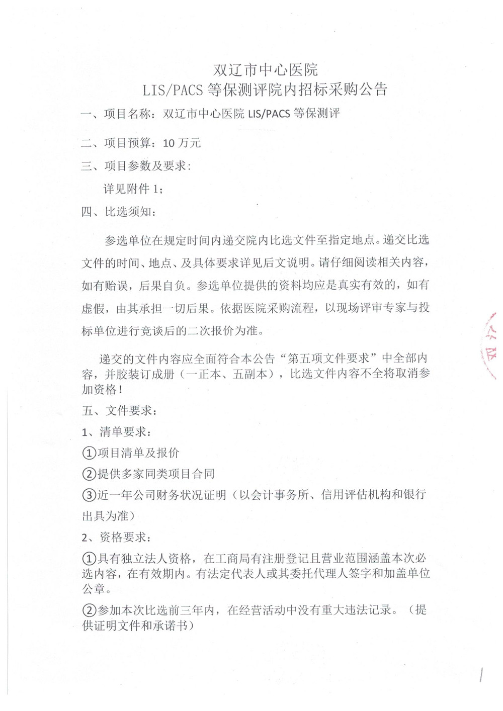 双辽市中心医院LIS/PACS等保测评院内招标采购公告
